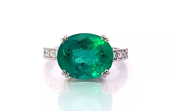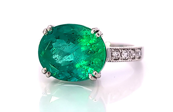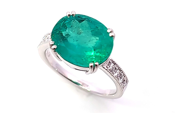 譲り受けた大粒のエメラルドリングは、華やかなデザインでなかなか使えず眠ったままに。そこで、4カラットの存在感を活かしながら、シンプルで日常にも使いやすいデザインにリフォームしました。石は横にセッティング、プラチナとメレダイヤで上品に仕上がり、装いを選ばず身に着けられるリングに生まれ変わりました。
