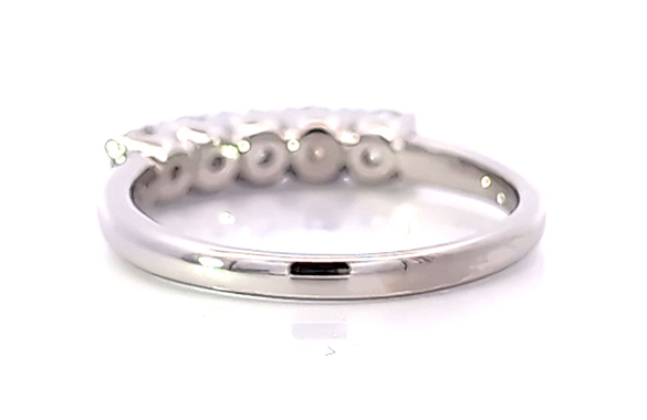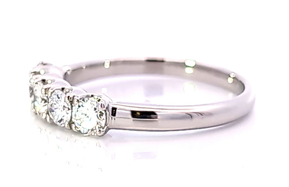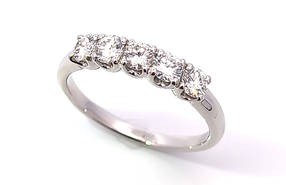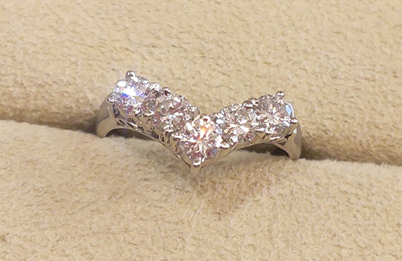 V字に並んだ5石で0.7カラットのプラチナダイヤリングを、一文字タイプのリングにリフォーム。ダイヤの輝きをまっすぐに並べることで、指元にすっきりとした印象と上品な華やかさが加わりました。普段使いにもフォーマルにも活躍するデザインです。