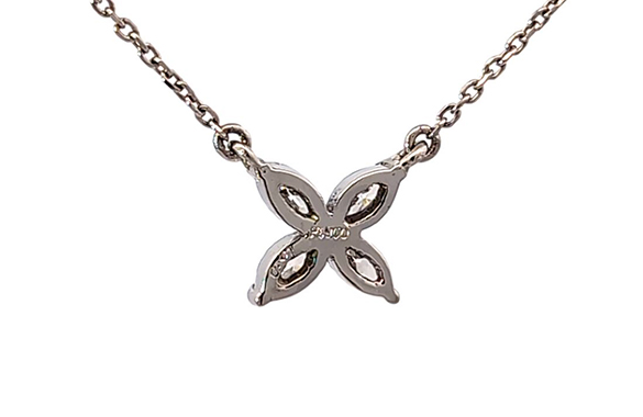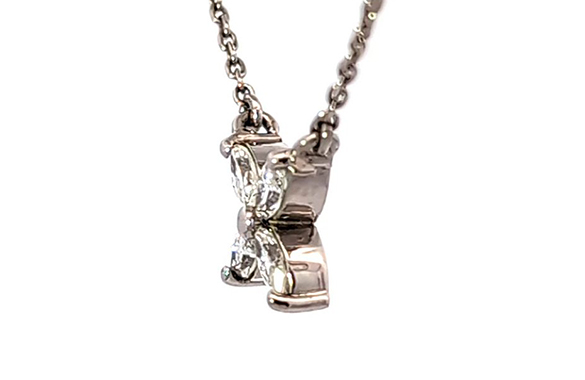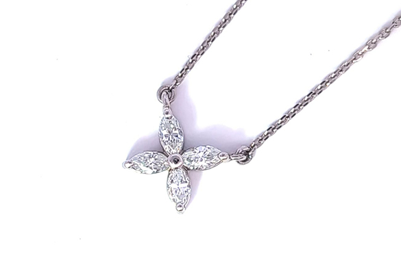 マーキスカットダイヤをあしらったプラチナリングを、ネックレスにリフォームしました。リングに並んでいたダイヤの中から4ピースを選び、花びらのようにセッティング。上品で可憐な印象のプチネックレスに生まれ変わりました。