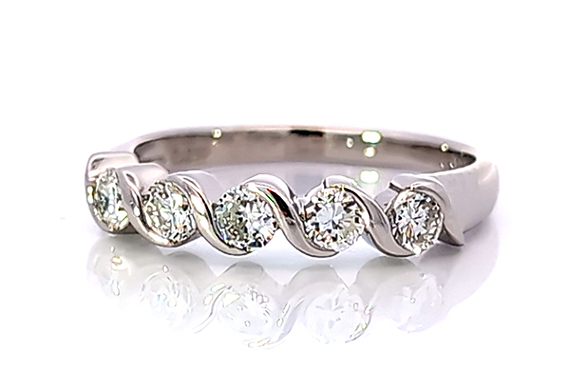 5石で0.61ctのプラチナダイヤリングを、柔らかなウェーブラインが印象的なデザインにリフォーム。高さを抑えて引っかかりにくく、指なじみのよい仕上がりに。毎日でも身に着けたくなる、上品で使いやすいリングに生まれ変わりました。