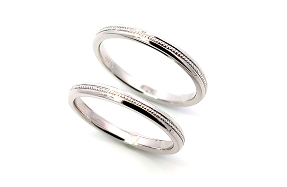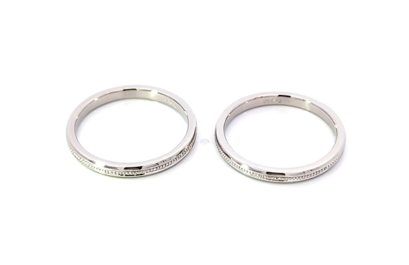 リフォーム後残ったプラチナリング枠を再利用して、甲丸&センターにミル打ちデザインのリング二本にリフォームしました。細身のシルエットとクラシカルなミル装飾がキラキラしたシンプルなリングに生まれ変わりました。