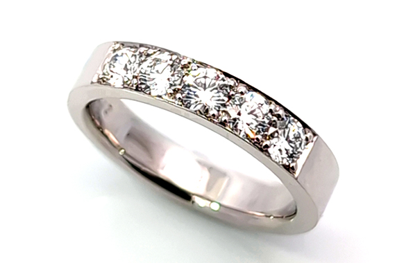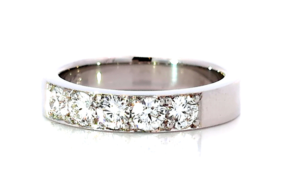 お持ちのダイヤ5石(各0.1ct以上)を使用して、プラチナのハーフエタニティ風リングにリフォームいたしました。シンプルながらも華やかに輝くデザインで、石をリングに埋め込んだ日常使いにも特別な日にもぴったりの一本に仕上がりました。