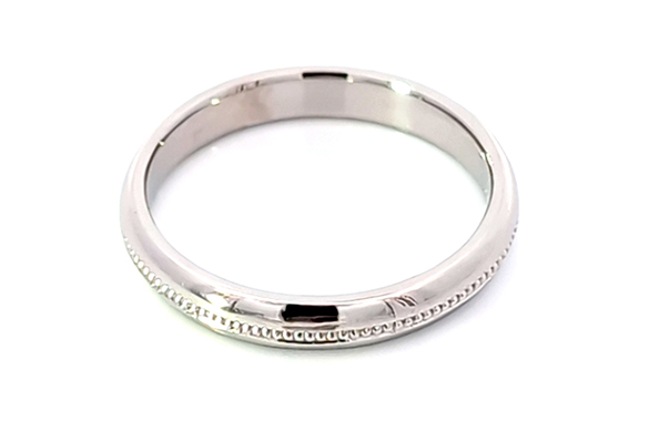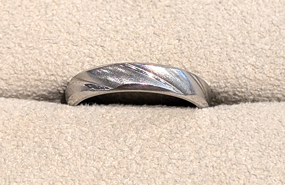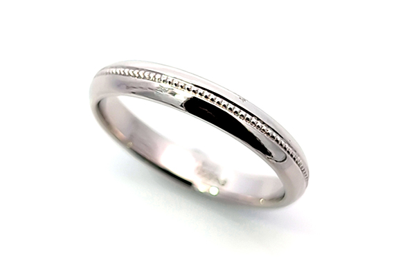 使わなくなったプラチナリングとパールリングの枠を活かして、新たに甲丸デザインのプラチナリングへリフォームいたしました。リング幅は3mm、中央には繊細なミル打ちを施し、シンプルながらもクラシカルな雰囲気に仕上がっています。