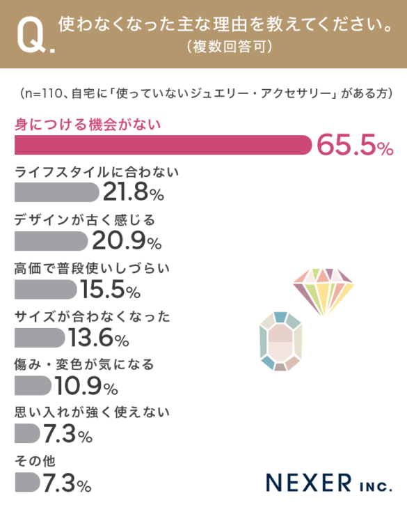 圧倒的に多かったのが「身につける機会がない」で65.5%でした。実に6割以上の方が、ジュエリーそのものが嫌いになったわけではなく、ライフスタイルの変化によって身につけるタイミングを失っていることがわかります。