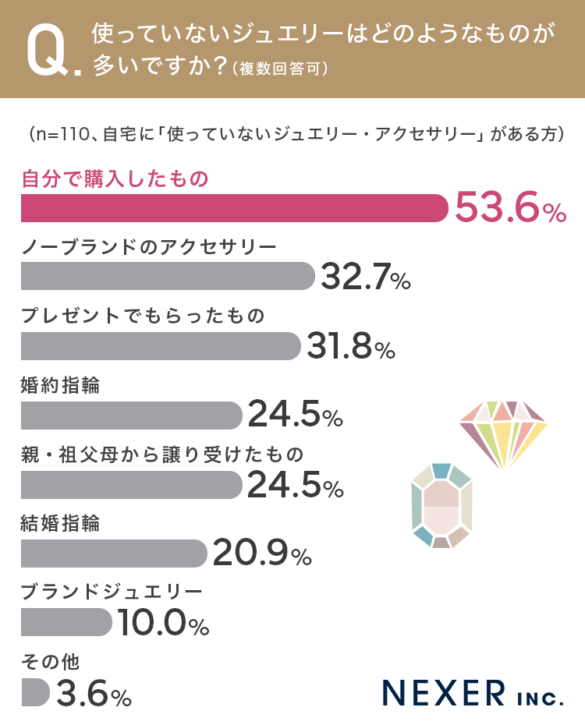 最も多かった回答は「自分で購入したもの」で53.6%でした。半数以上の方が、自ら選んで買ったジュエリーを使わなくなっていることがわかります。
