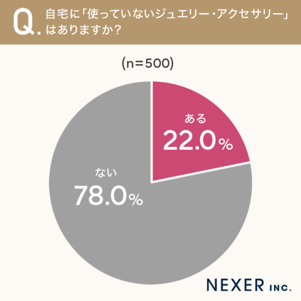 その結果、22.0%の方が「ある」と回答しました。つまり、約5人に1人が、自宅に使っていないジュエリーやアクセサリーを持っていることがわかります。