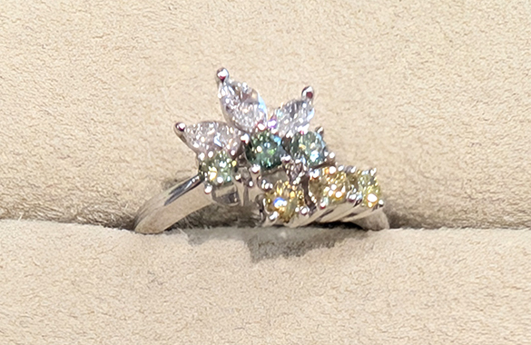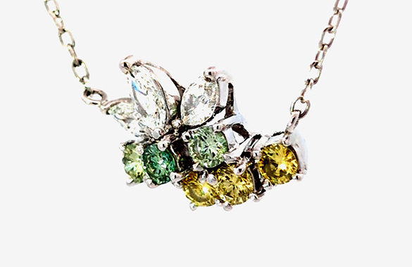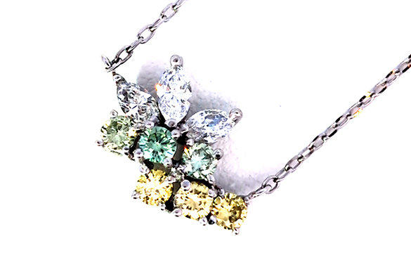 プラチナのカラーダイヤリングを、デザインはそのままでネックレスへリフォームしました。リング部分をカットし 華やかなフォルムと繊細な石の配置を活かし、胸元で美しく映える仕上がりになりました。お気に入りのデザインを、新たなかたちでお楽しみいただけます。