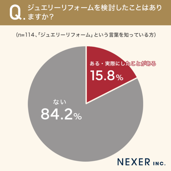 その結果「ない」が84.2%、「ある・実際にしたことがある」が15.8%という結果でした。ジュエリーリフォームを知っている方のなかでも、実際に検討したり利用したりしたことがある方はまだ少ないことがわかります。