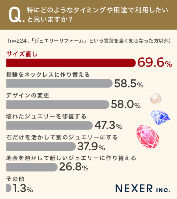 ジュエリーリフォームのなかでも、サイズ直しが最も広く知られており、日常的に利用されていることがわかります。