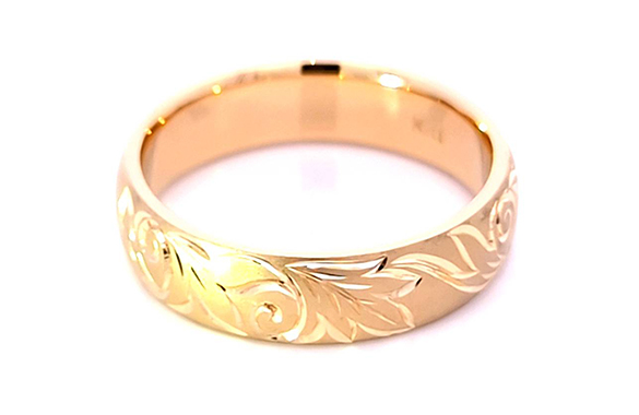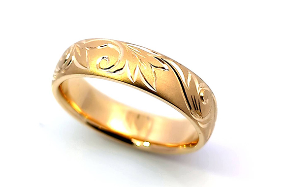お手持ちのK18リング2点とネックレス2点を溶かして再利用し5mm幅の平甲丸リングにリフォームしました。表面には繊細な唐草模様を彫り込んだ、あたたかみのあるデザインに仕上げました。