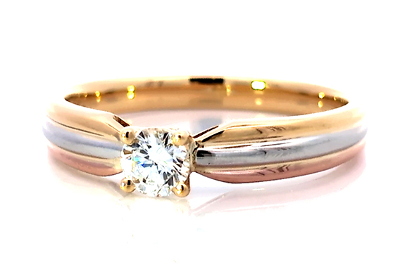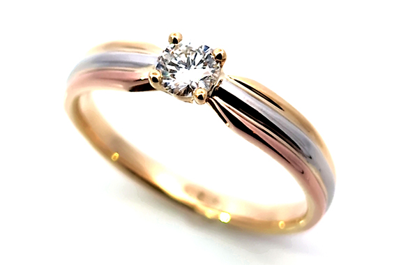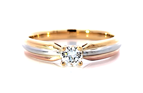 0.3カラットのプラチナ立爪リングを、3カラーのデザインリングにリフォームしました。イエロー・ホワイト・ピンクゴールドの3色が交差する洗練デザインに生まれ変わりました。