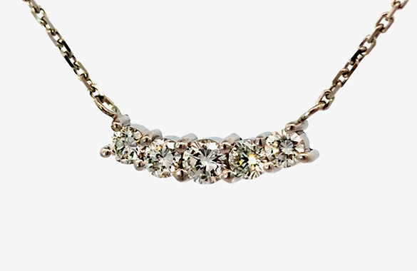 5石で1カラットのプラチナダイヤ一文字リングをネックレスにリフォームしました。ボリュームのある一文字デザインのリング。今回はリングのプラチナ素材も活かして、ダイヤ5石を横一列に並べたバータイプのネックレスにリフォームしました。上品な輝きがデコルテに映える、日常使いしやすいシンプルで華やかな仕上がりになりました。