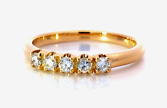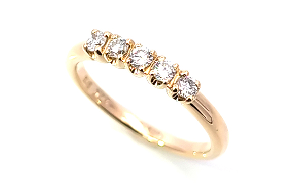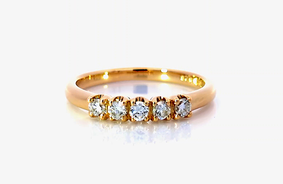 プラチナの5石ダイヤリングを、温かみのあるK18ダイヤリングへリフォームしました。ダイヤはそのまま活かし、素材をゴールドに変えることで、やわらかく華やかな印象に。日常使いしやすい、上品な一本へと生まれ変わりました。
